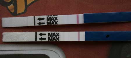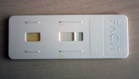 Her er min første positive test, jeg havde besvær med finde ud af tage dem. Men fik lidt hjælp og så var den der, og det var også den cyklus jeg blev gravid i…